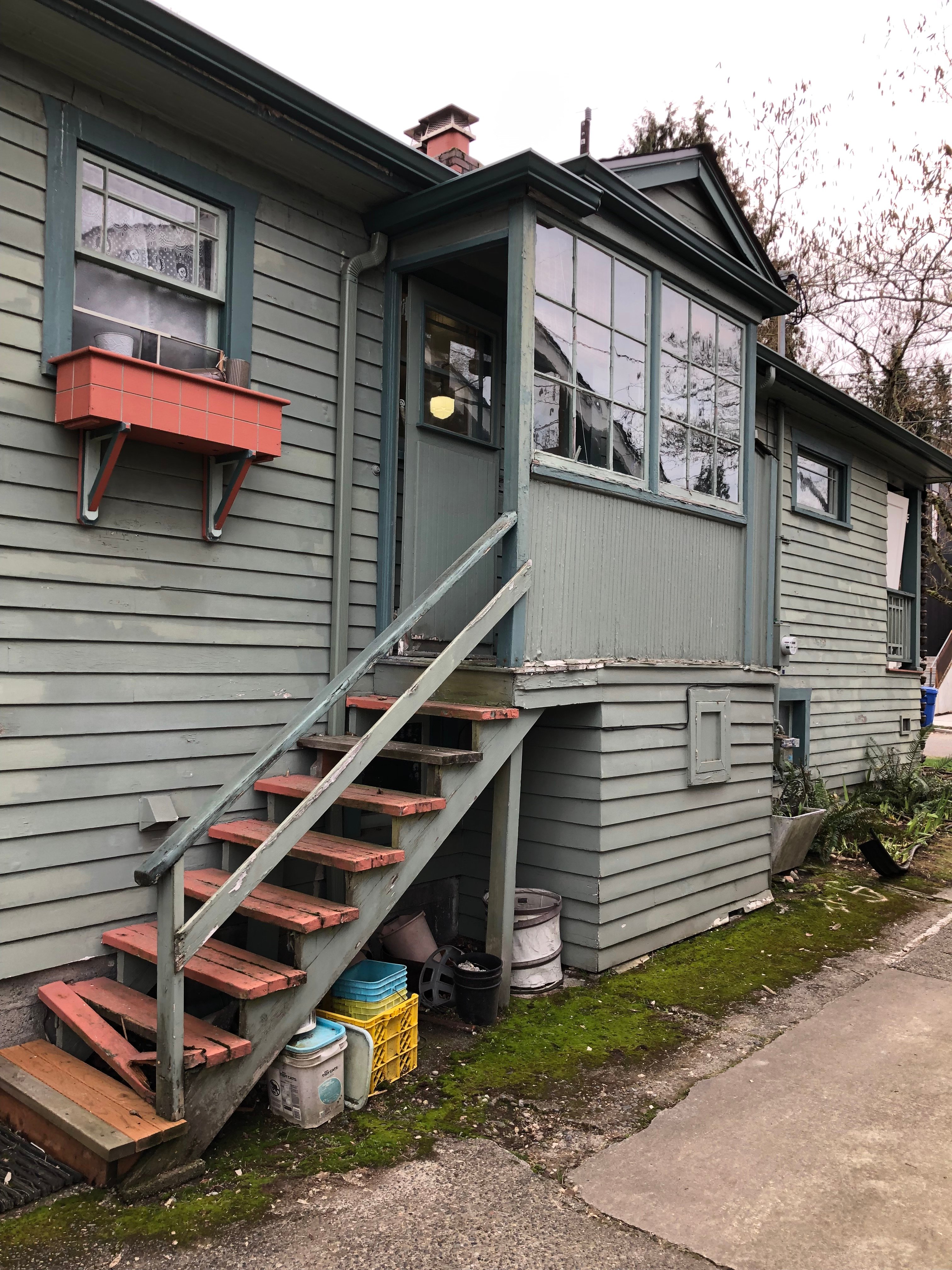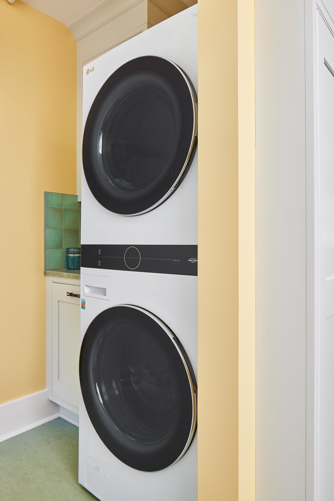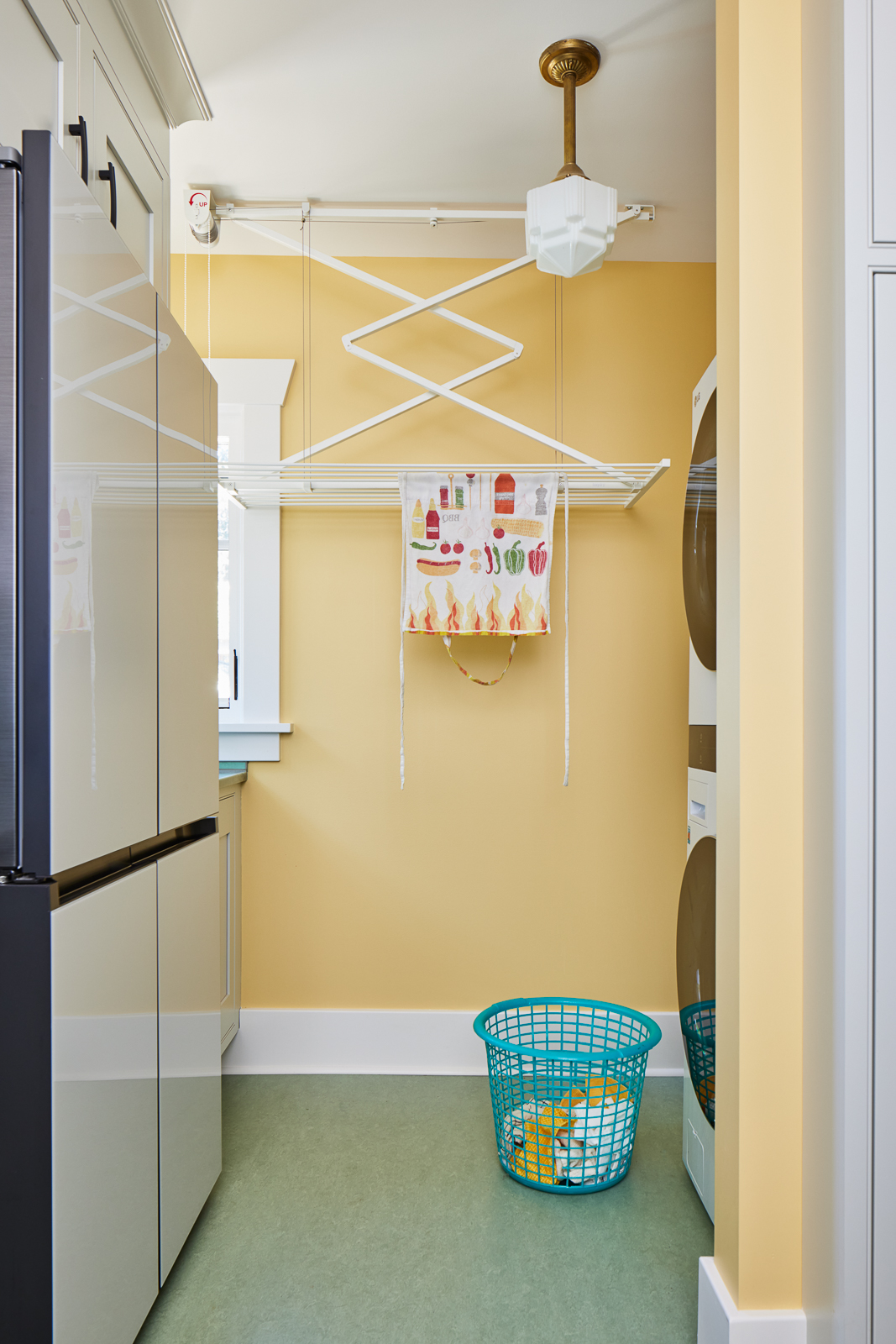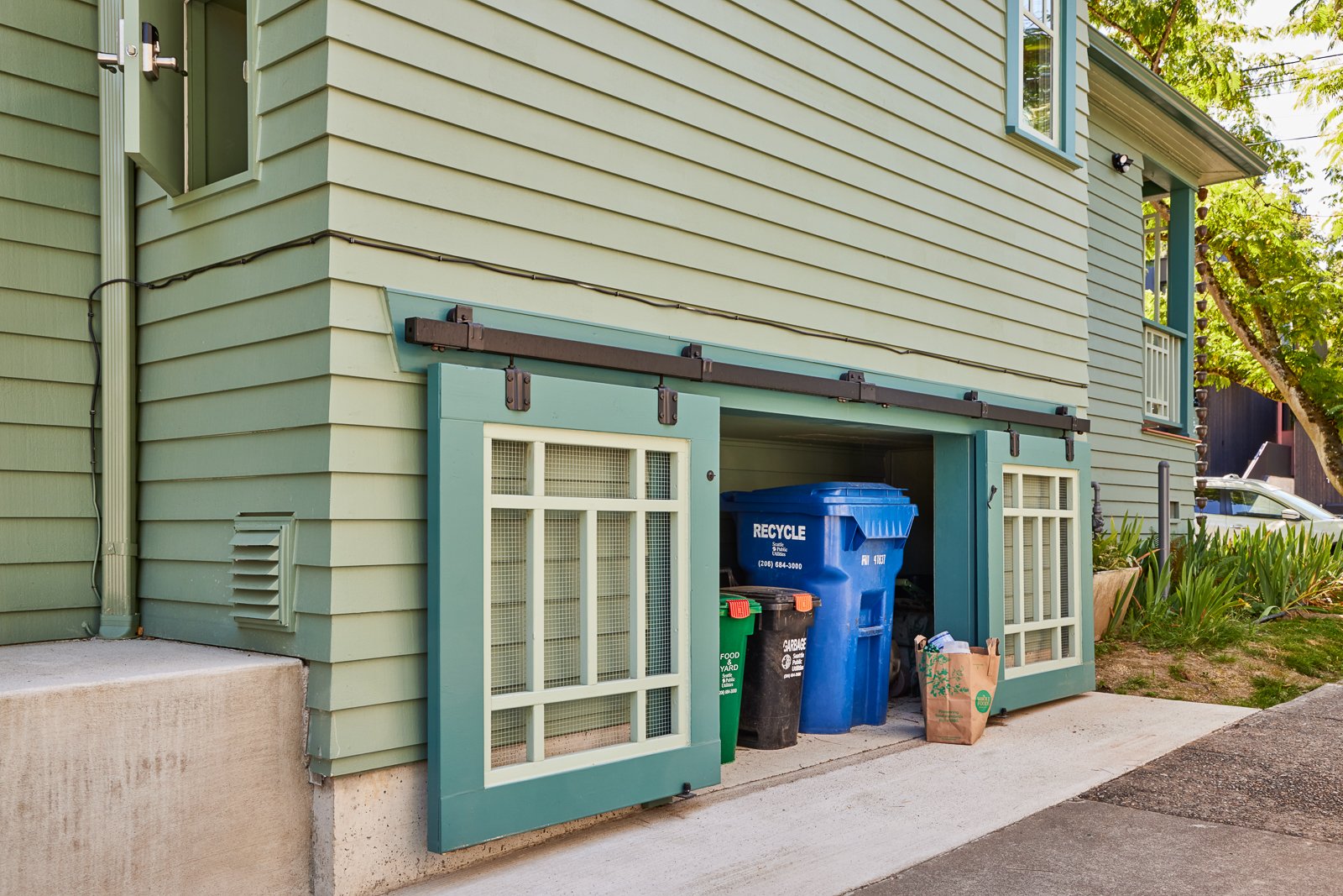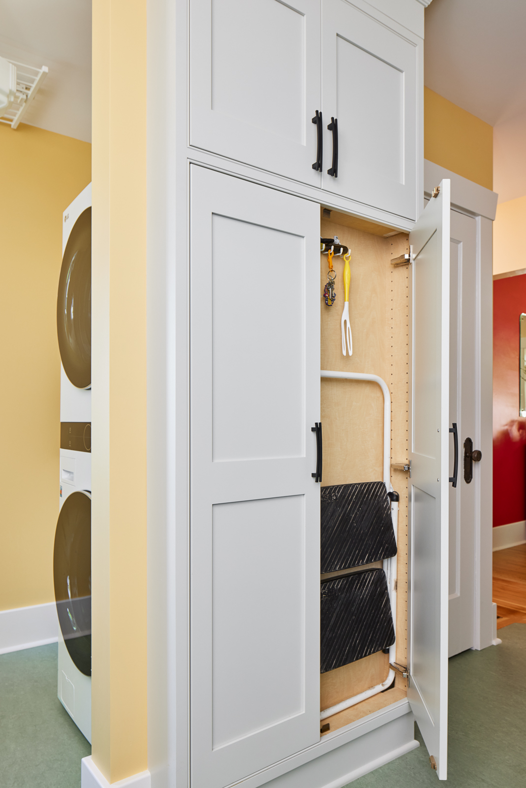 Interior kitchen cabinet with an exterior connection. Laundry facilities brought upstairs and added to her kitchen. An easily accessible place for her to store her outdoor garbage and recycling that fits in with the overall aesthetics of the home.