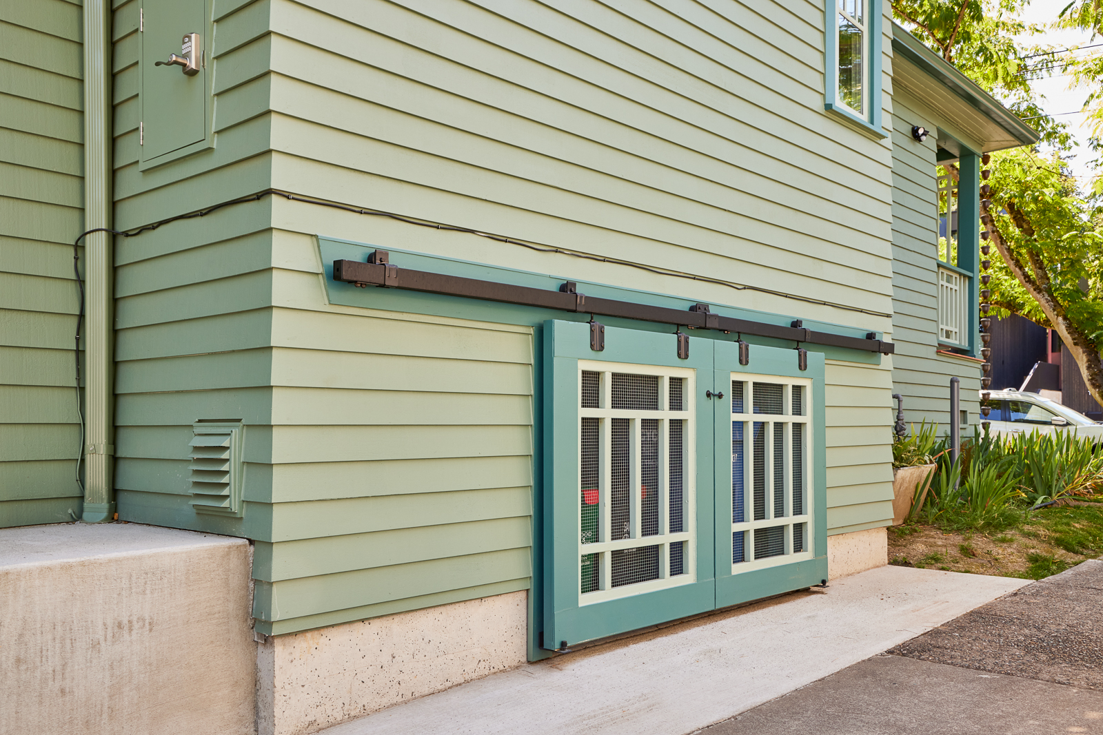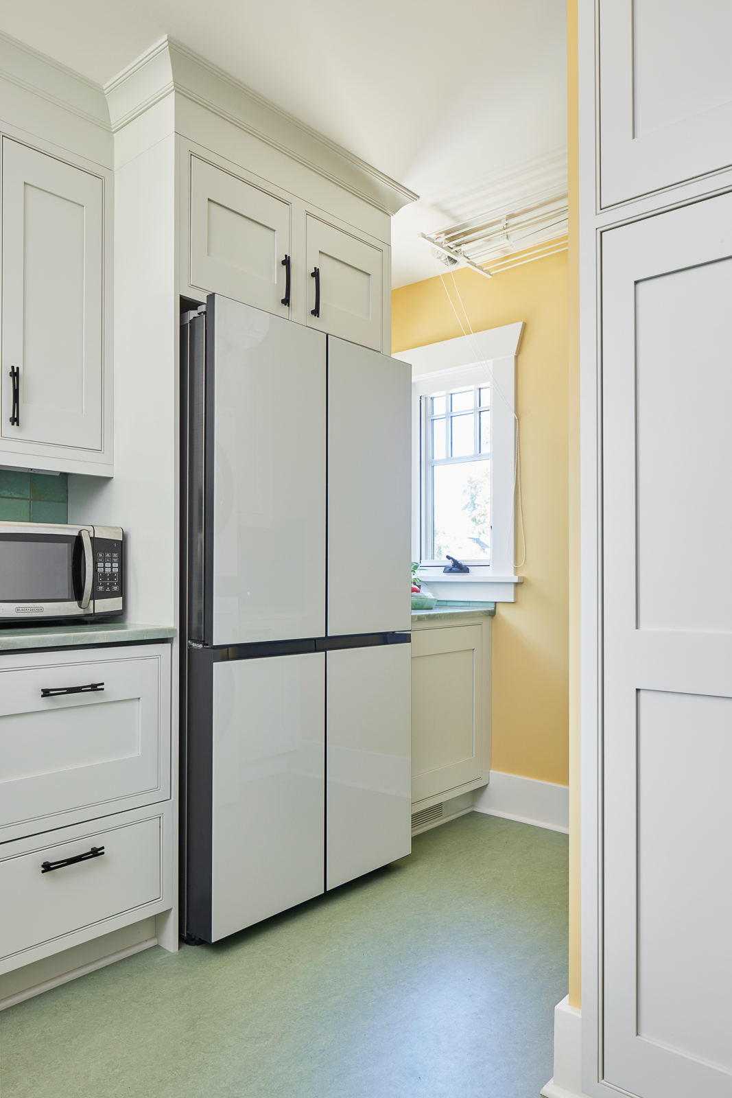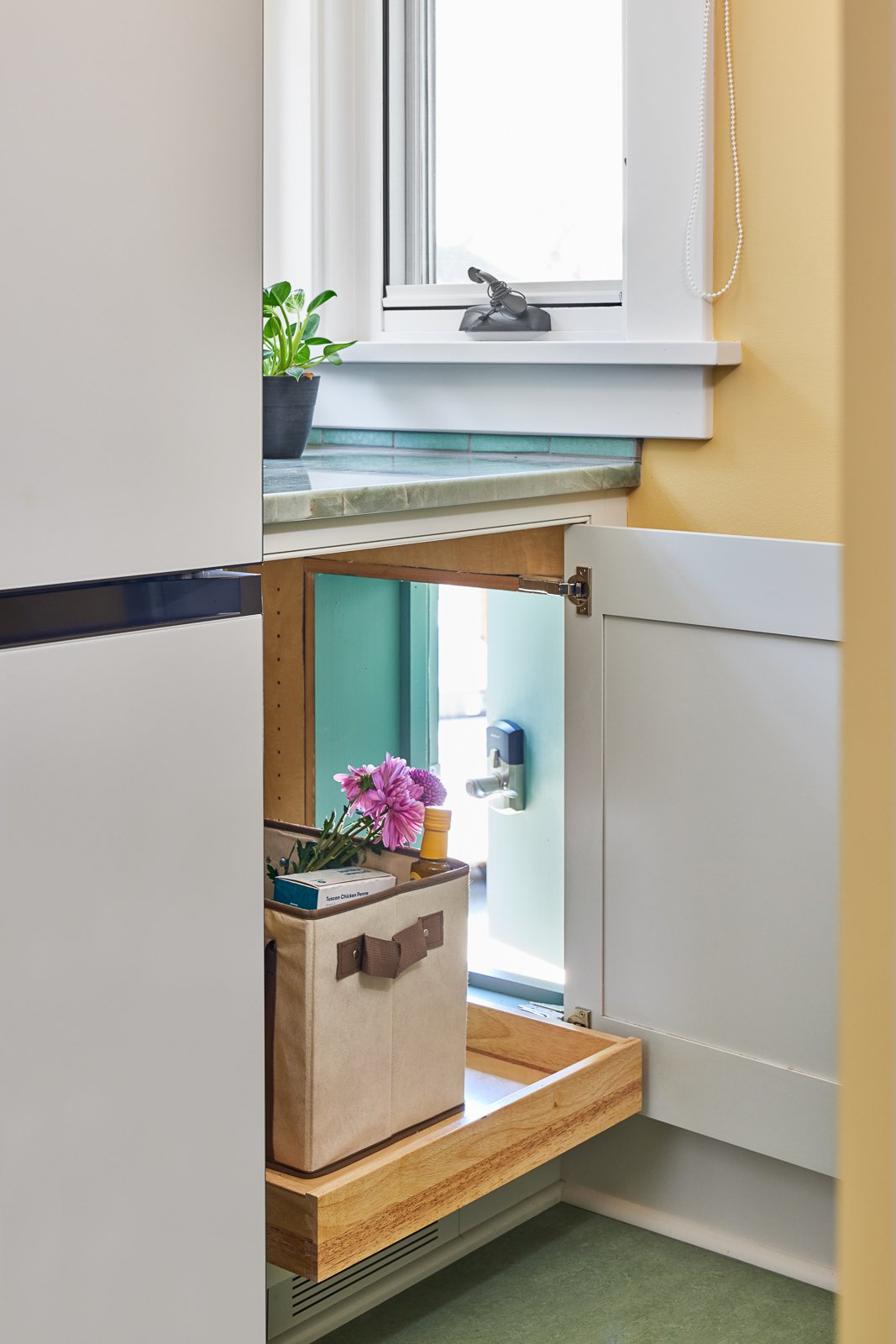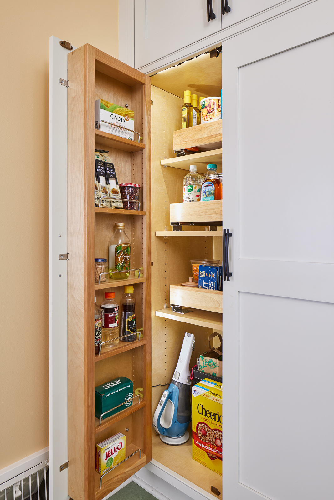 Since we were in the process of remodeling her kitchen space, we were able to utilize additional square footage from an existing back porch area to enlarge the kitchen space. This expansion not only enhanced the kitchen overall but also provided us the ability to bring her laundry facility into that same space, as well as adding a covered area tucked away at ground level to store her garbage and recycling where it would be free from the local racoons. This ultimately illuminated her need to access the basement. We worked as a team to come up with an alternative to the dumbwaiter. After much thought, we created an exterior locked door that connects to an interior kitchen cabinet, making it easy for her to bring groceries inside and take garbage outside without having to haul these items up and down a steep set of stairs.