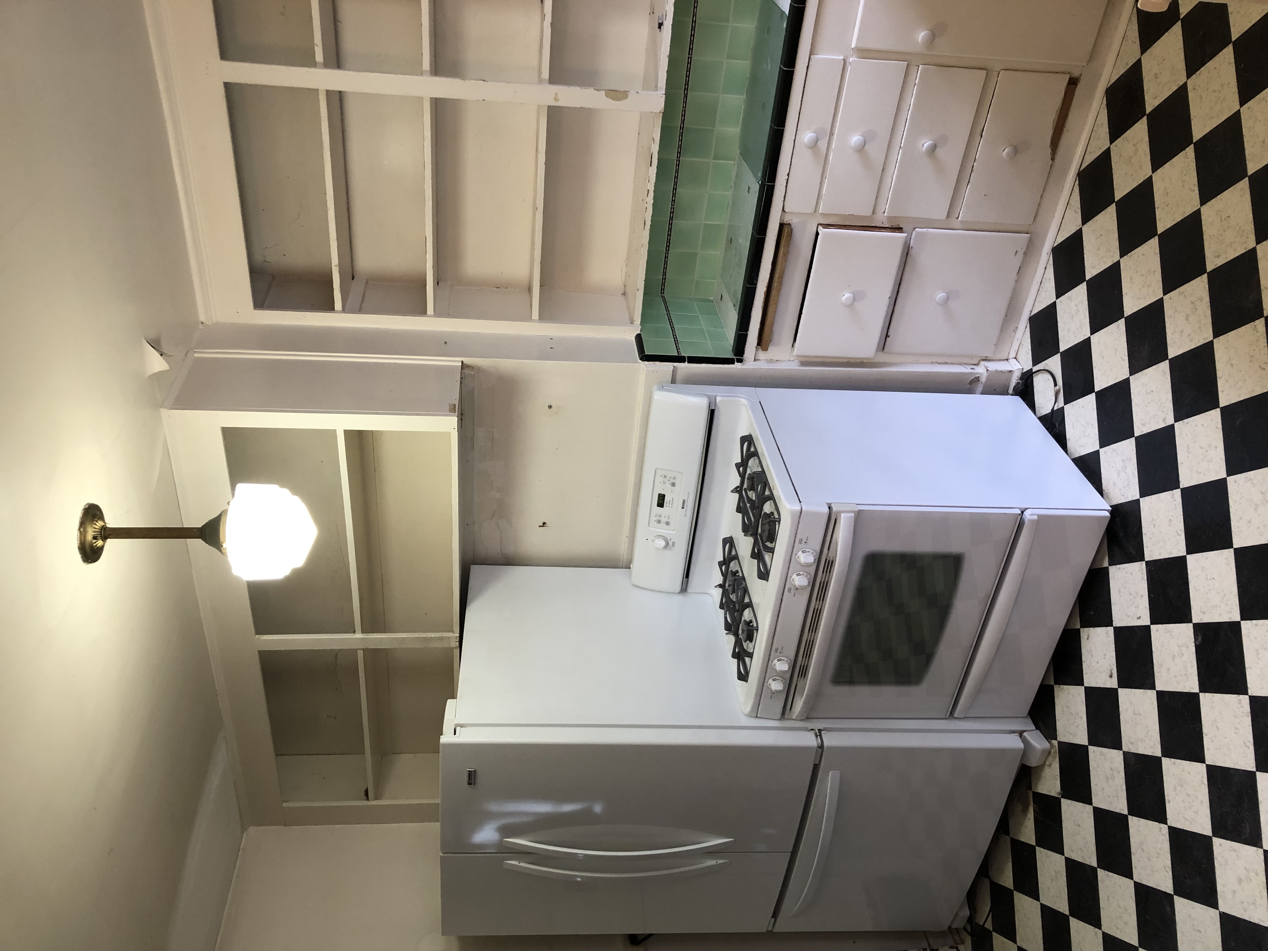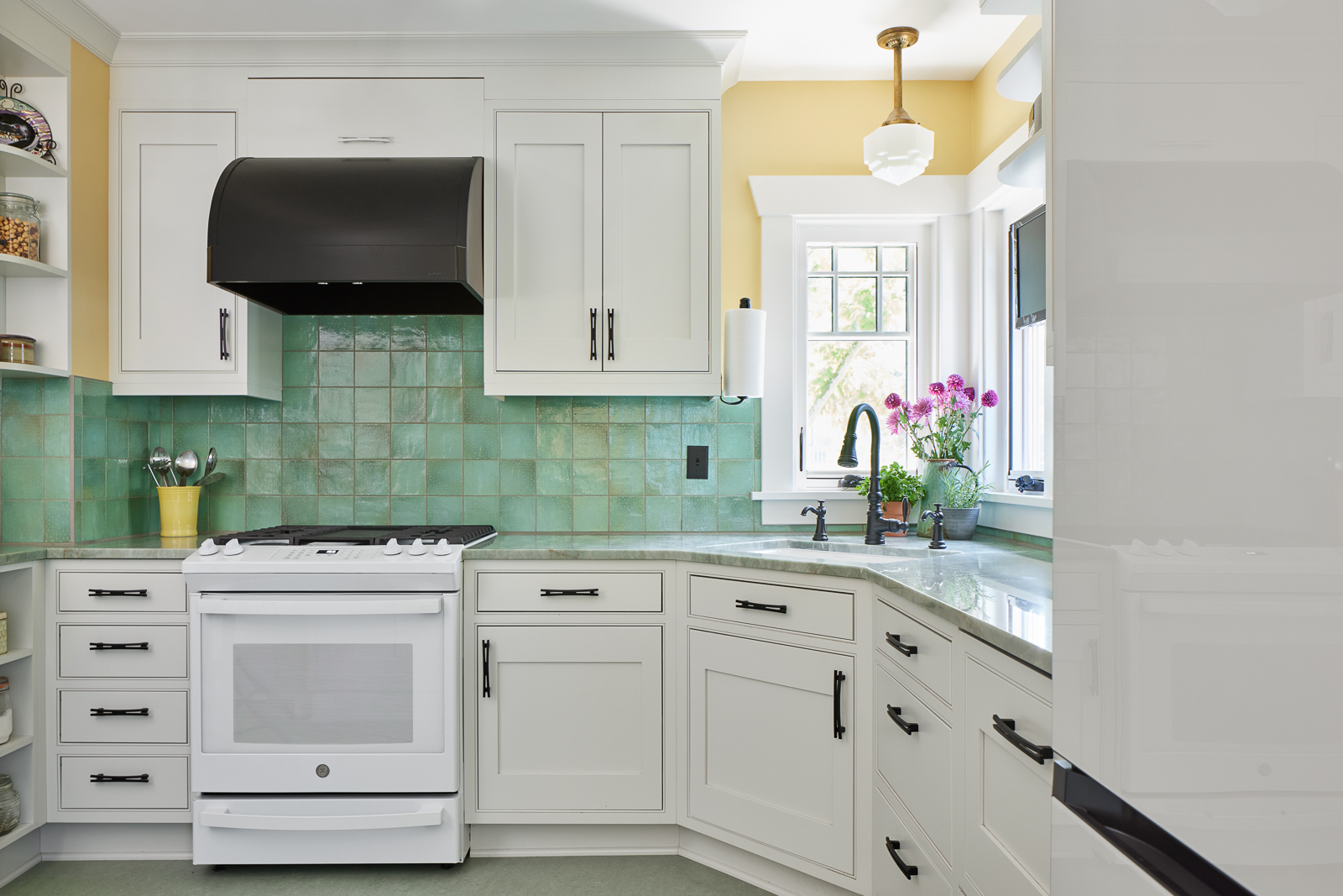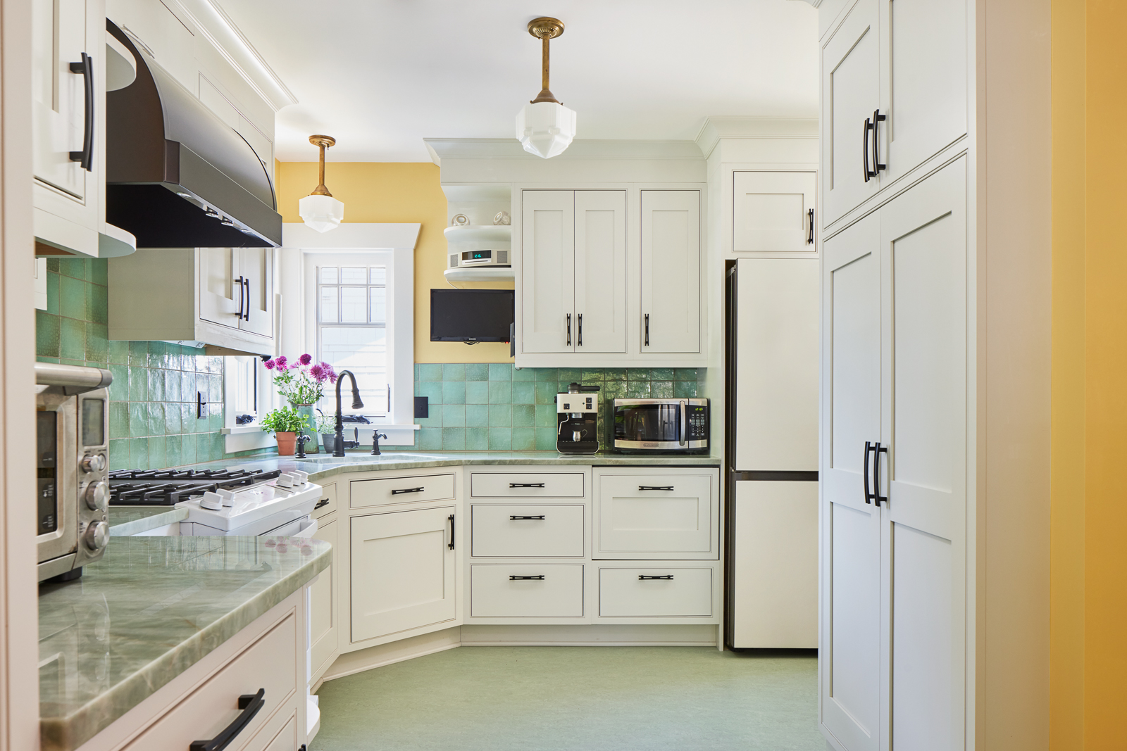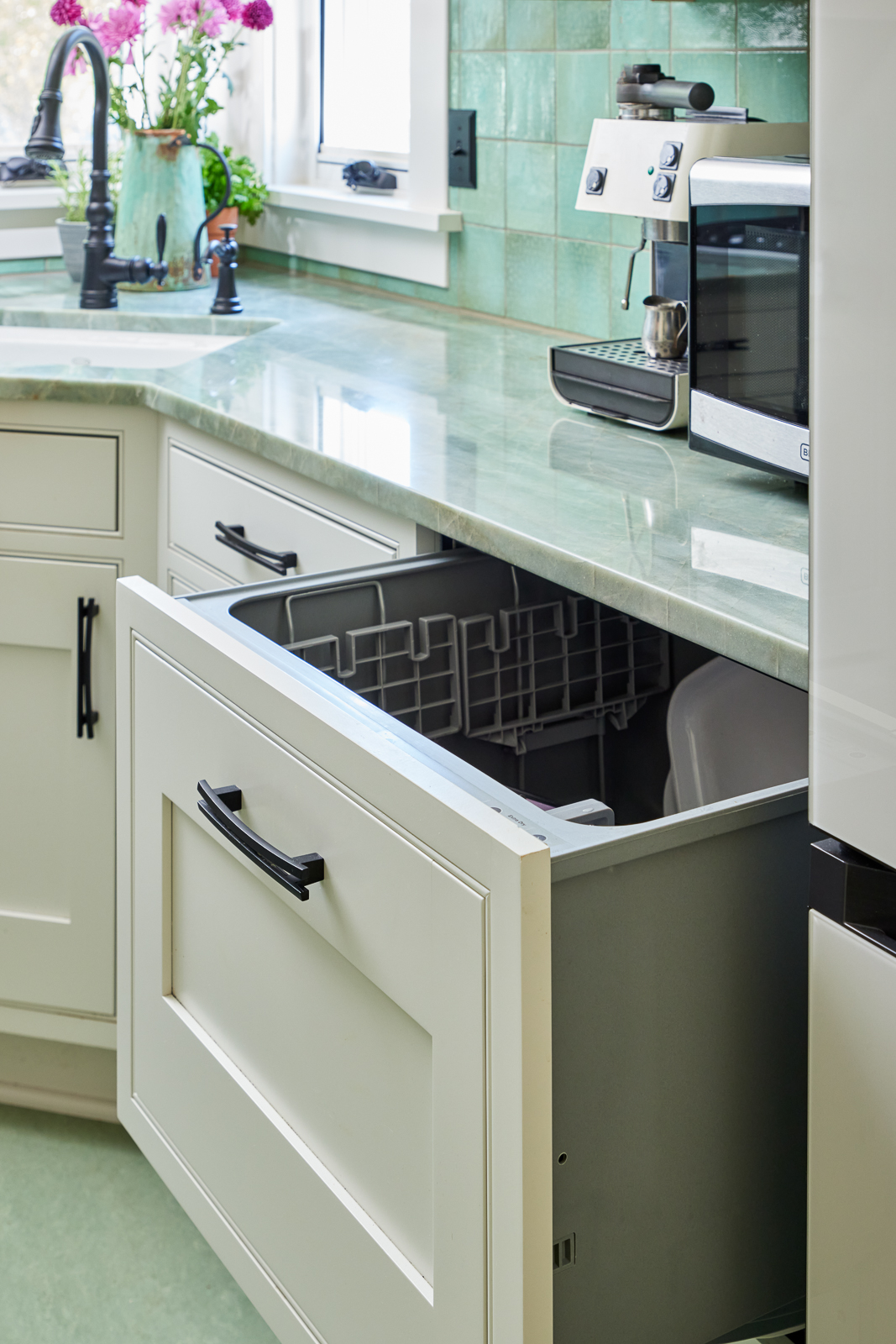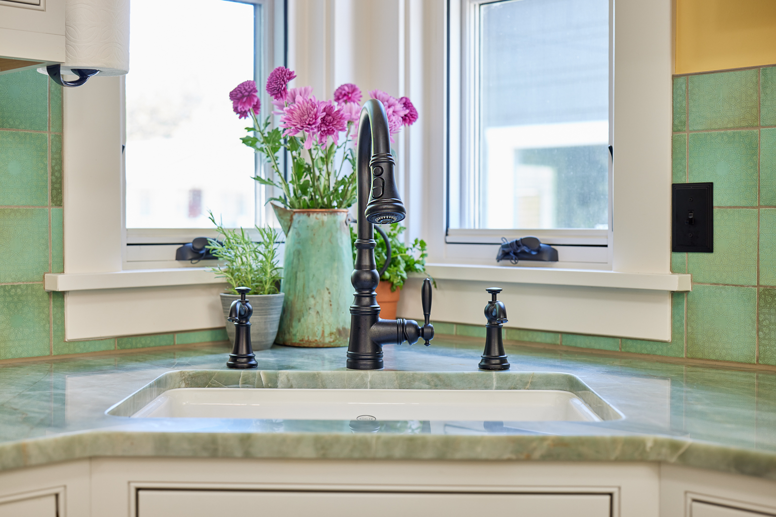 Since we were in the process of remodeling her kitchen space, we were able to utilize additional square footage from an existing back porch area to enlarge the kitchen space. This expansion not only enhanced the kitchen overall but also provided us the ability to bring her laundry facility into that same space, as well as adding a covered area tucked away at ground level to store her garbage and recycling where it would be free from the local racoons. This ultimately illuminated her need to access the basement. We worked as a team to come up with an alternative to the dumbwaiter. After much thought, we created an exterior locked door that connects to an interior kitchen cabinet, making it easy for her to bring groceries inside and take garbage outside without having to haul these items up and down a steep set of stairs.
