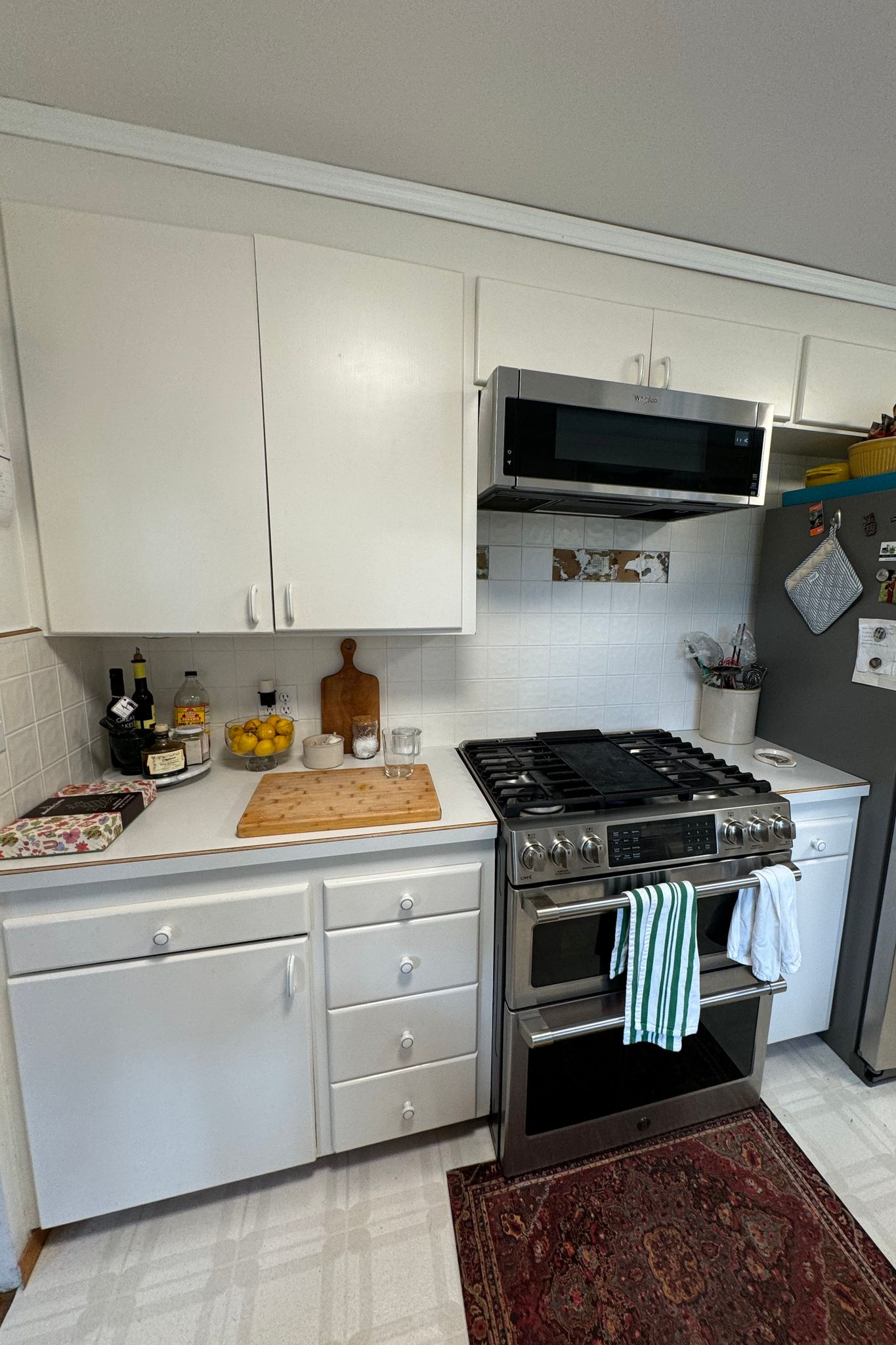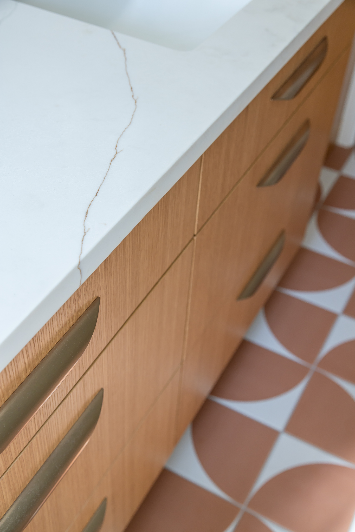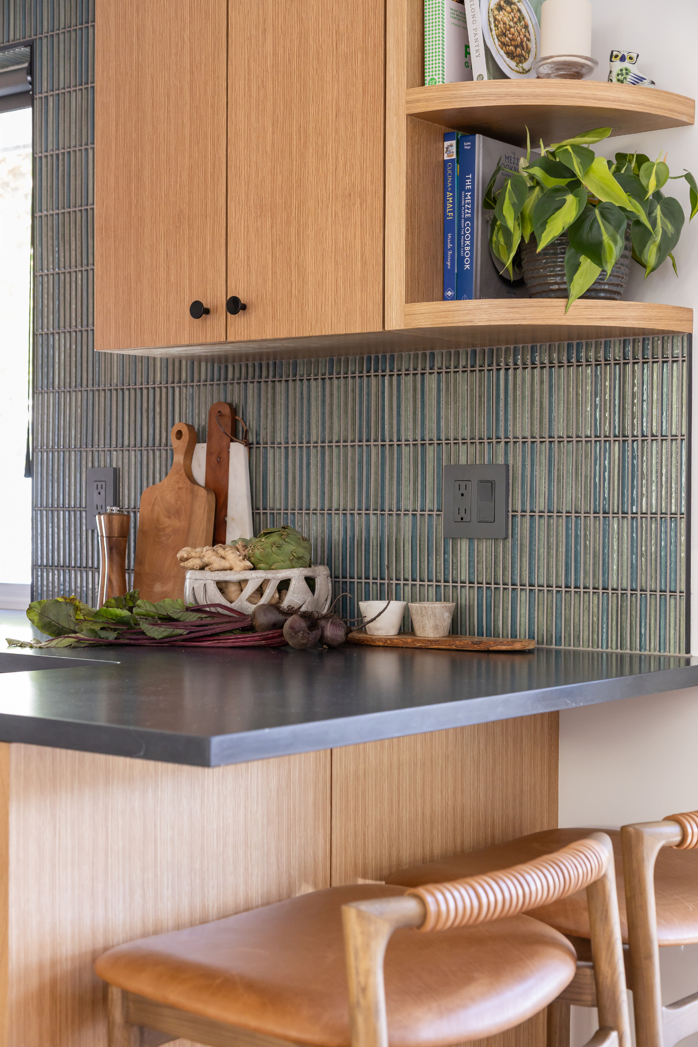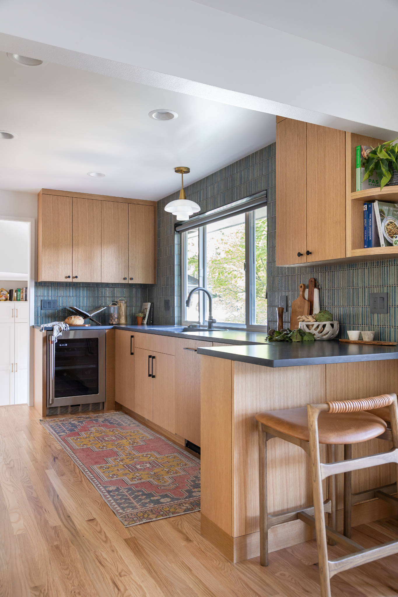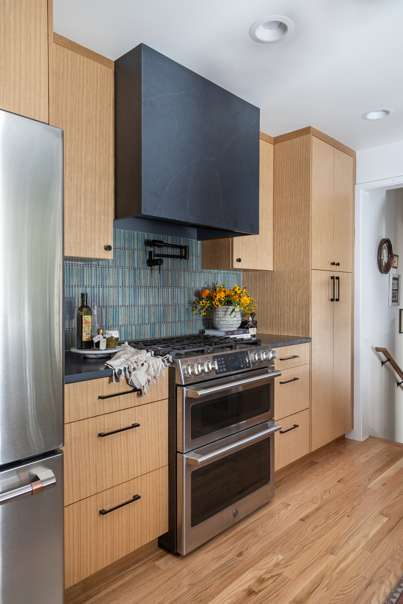 In the kitchen, the layout remained the same, but the transformation significantly improved both usability and aesthetic appeal. A vertical tile backsplash paired with vertical‑grain cabinetry creates visual rhythm, while a custom Dekton hood matched to the countertops adds a sculptural focal point. Strengthening the connection to the backyard was also a priority. Two mismatched windows were replaced with one larger opening that floods the room with natural light and reinforces the biophilic need for a visual link to outdoor spaces.