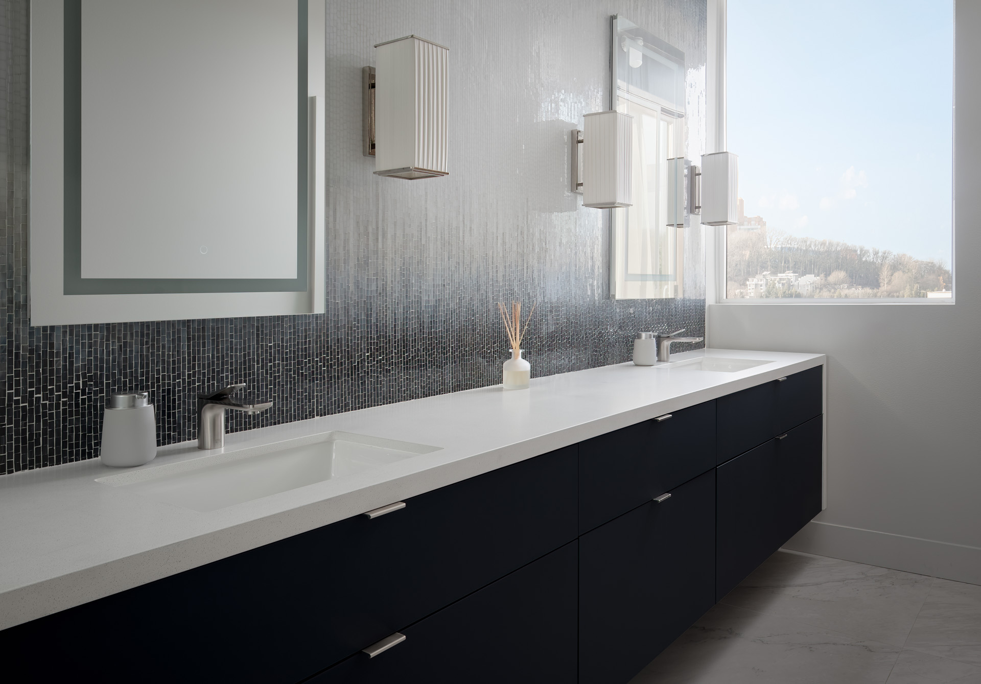 The kitchen now features a waterfall-edge island, integrated dishwasher, and column-style refrigerator and freezer for a sleek, modern look. A chef-grade 48” induction and gas range, custom tilework, and layered lighting under cabinets and toe kicks add luxurious touches.